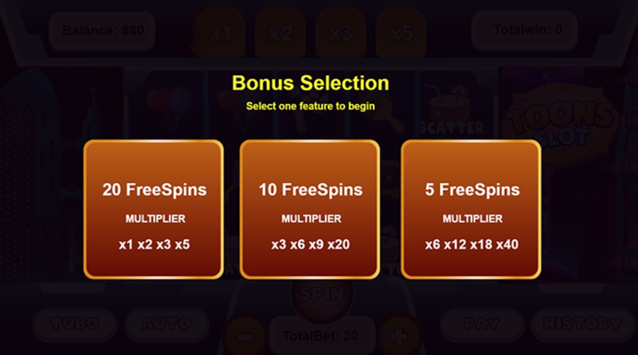 The free spin feature begins when three or more scatter symbols appear on the reels. Once activated, you can choose from several options with different numbers of spins and multipliers. Each option gives the game a new pace and rhythm, letting you enjoy the reels in a fresh way. Free spins add variety and energy to Toons Slot, giving players moments of pure animated fun. All features are created for entertainment only, allowing you to relax and enjoy a playful, colorful gaming experience.